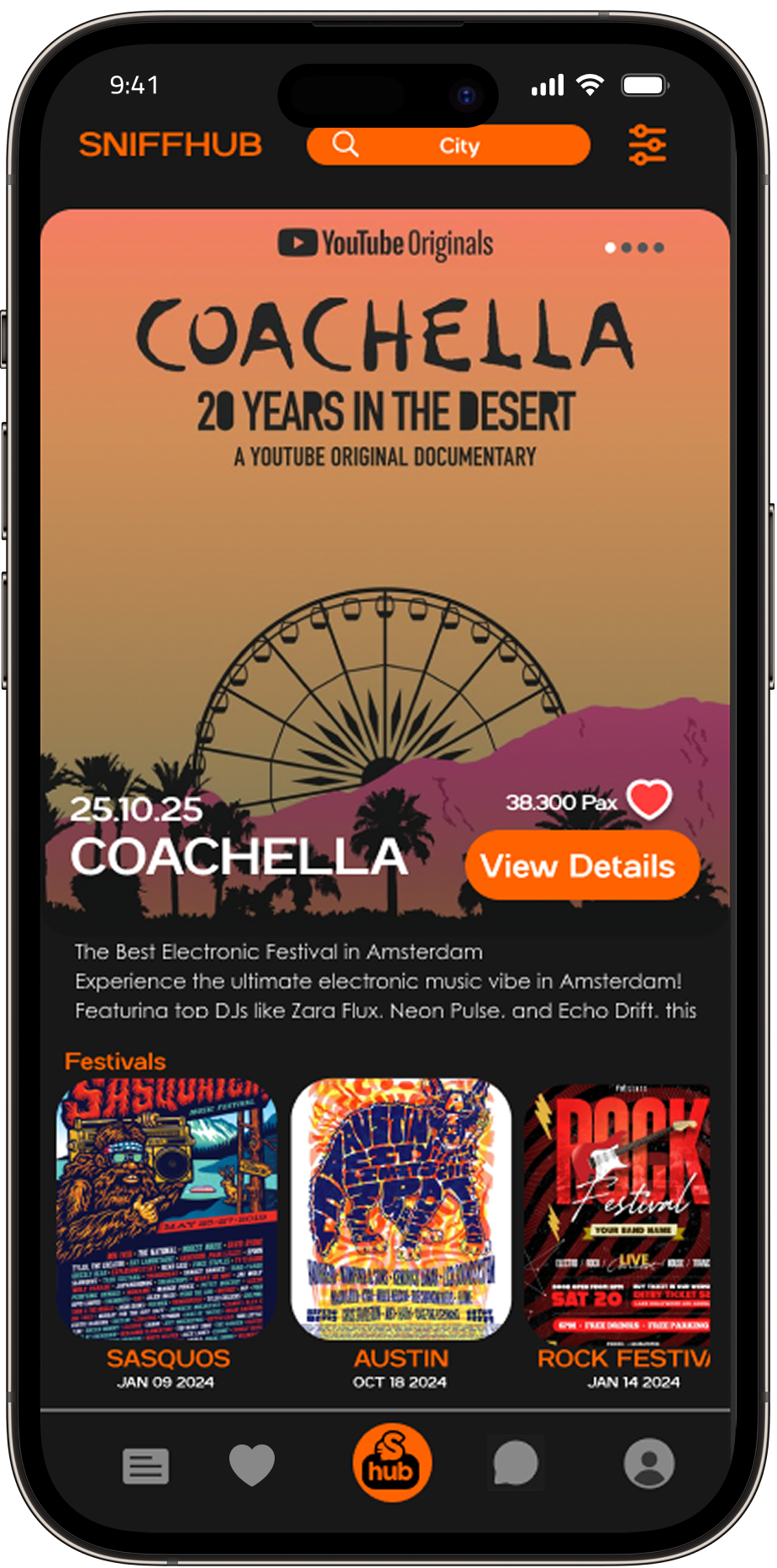 Whether you’re singing your heart out at Coachella, vibing at a local street festival, or discovering new faces at a spontaneous event, Sniffhub brings together people who share the same energy, passion, and curiosity for life.